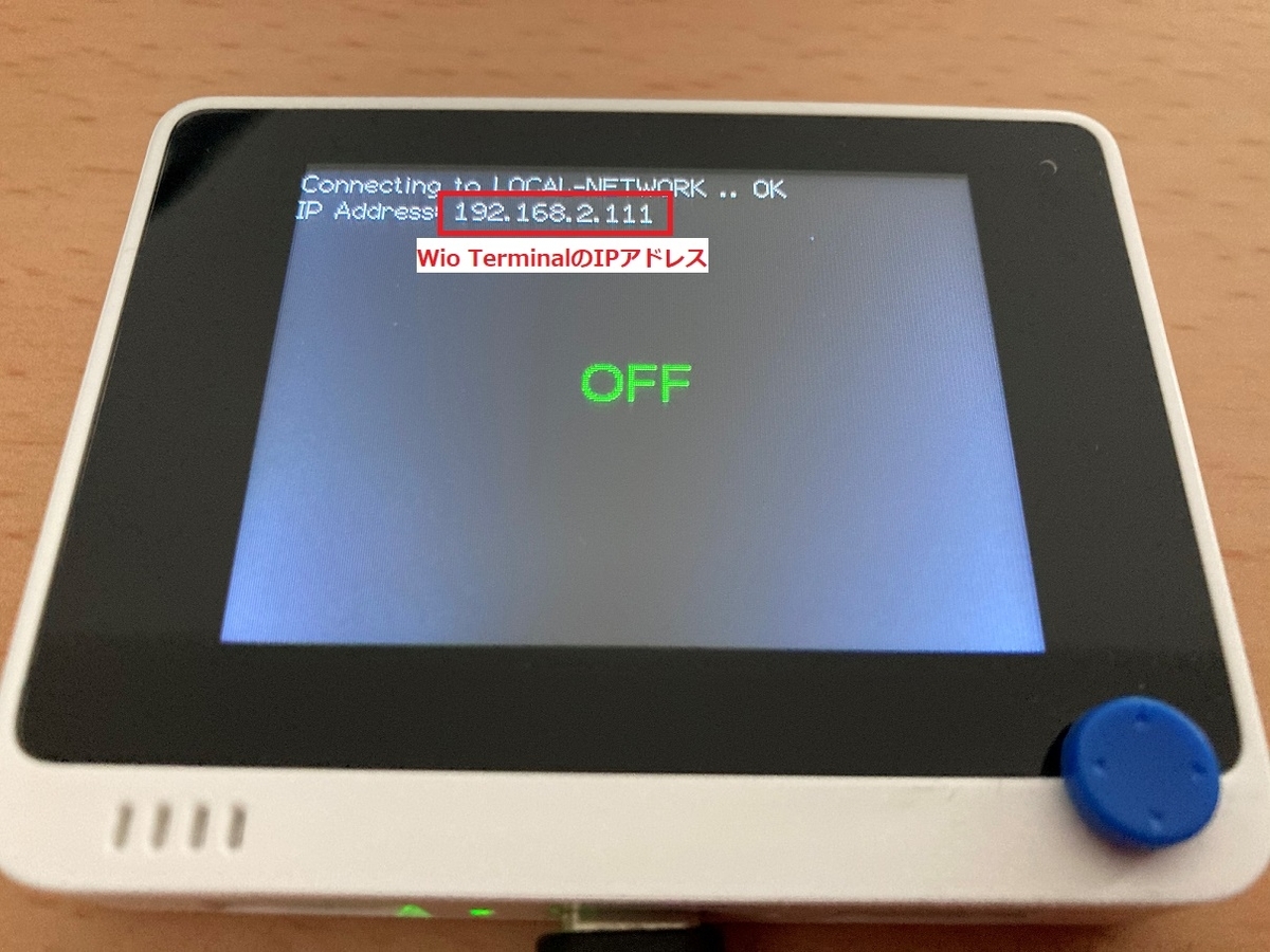 WPA3-SAEはつながりませんでした。 - Wio Terminalに書き込んで実行すると、IPアドレスが表示されるのでアクセスしてみます。
